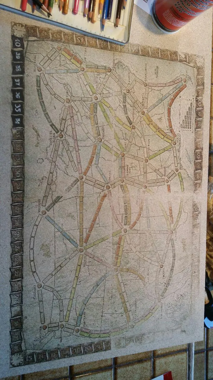 After making Settlers of Catan I wanted to make another game. I found that ticket to ride might be a good match however I didn't know how to make the map out of something durable. I could have printed it on paper but it would not be very strong. Then I thought about transfering ink from a printer onto wood. I quickly found on the internet that you can use acetone to transfer the ink from paper to wood. After scaling the map to print on multiple papers and flipping it, I applied it to the wood. It looked good but as good as I wanted to I retouched some parts of it with colour pencils. Then I finished it with some lacquer.